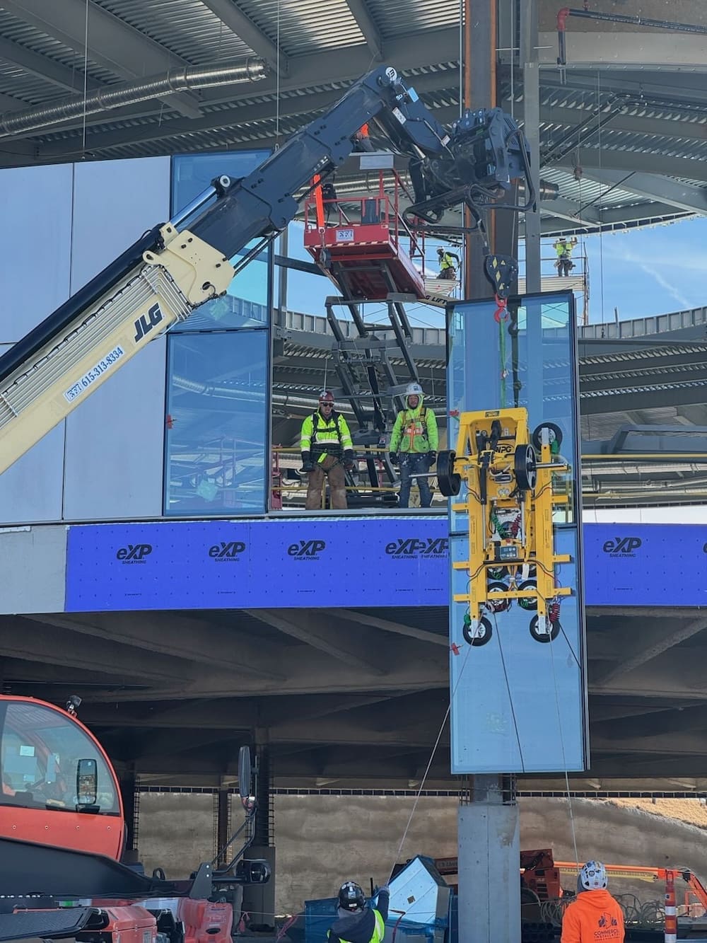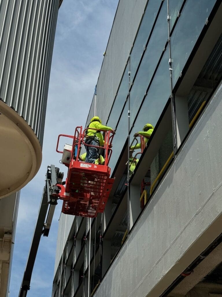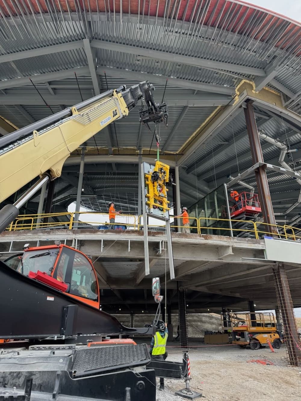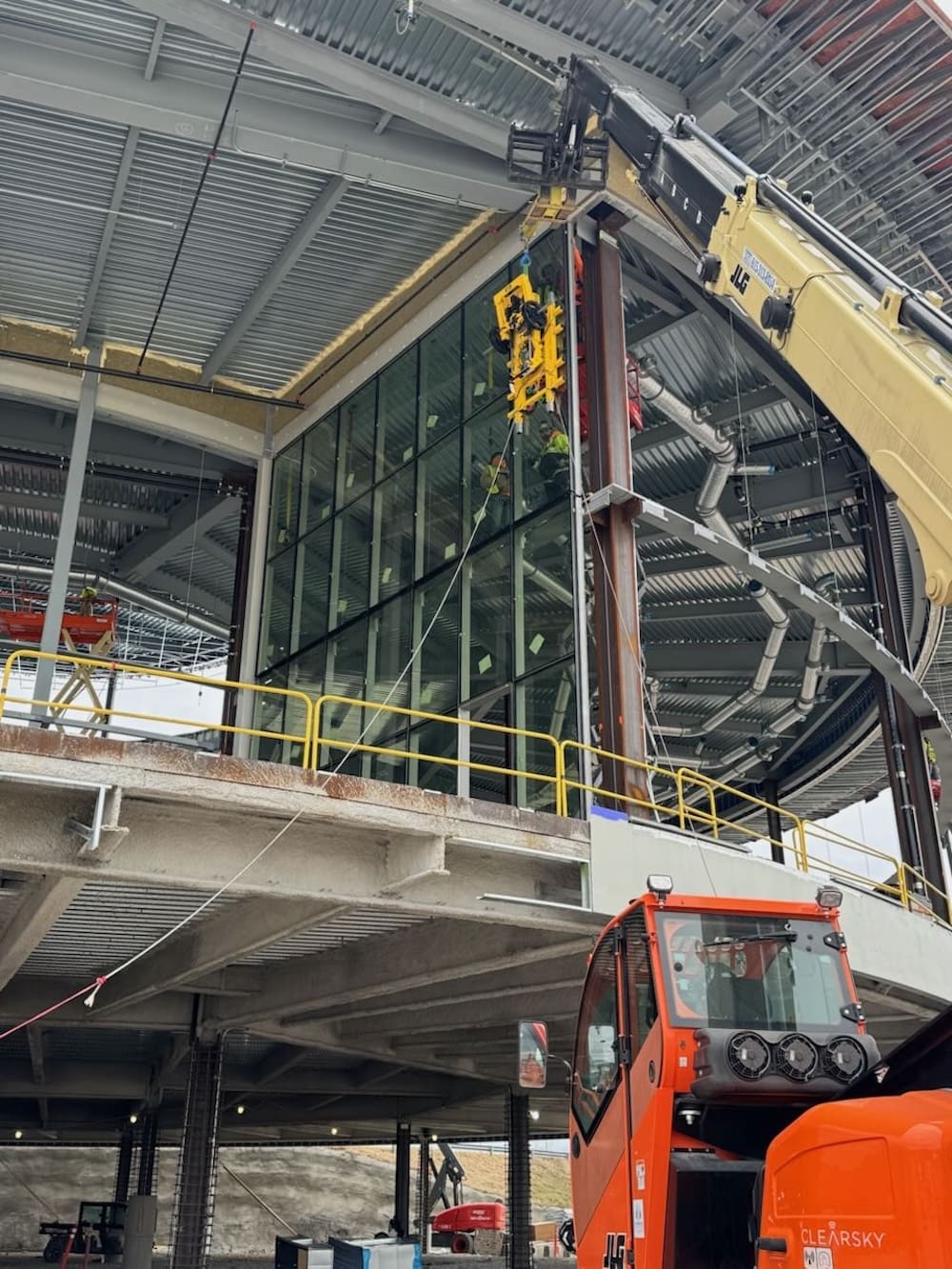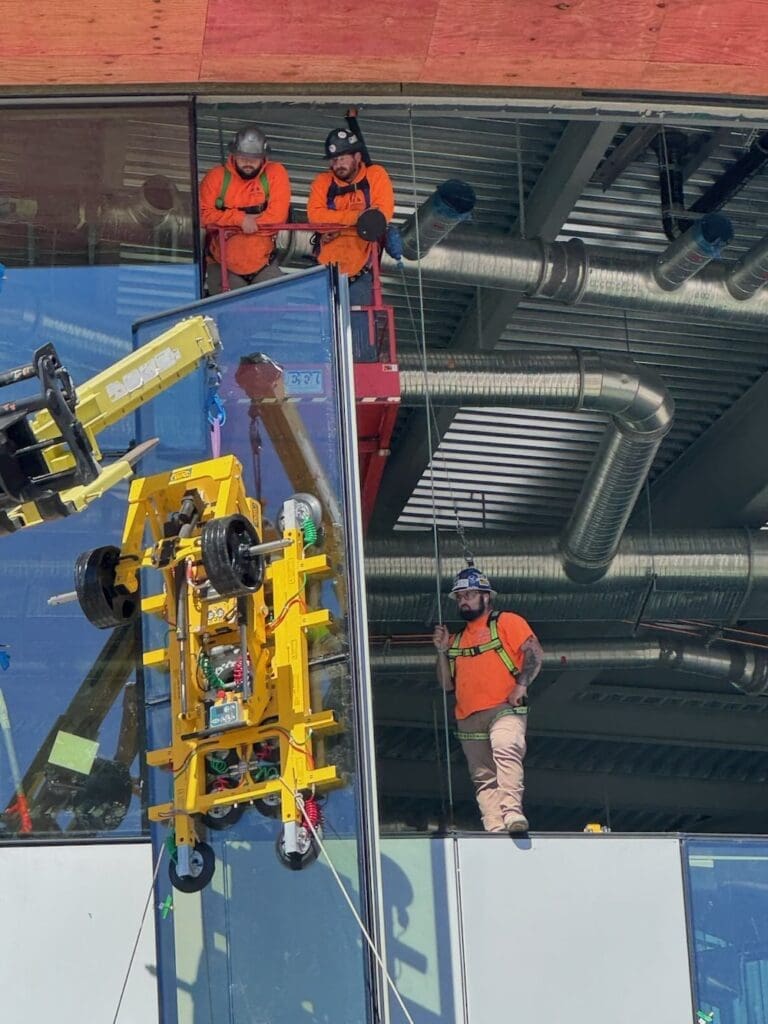 The work required precision, coordination, and advanced equipment to lift and set large glass panels into place. Our team utilized specialized rigging and vacuum lifts to safely position the curtain wall units, ensuring perfect alignment within the structural steel framework.
